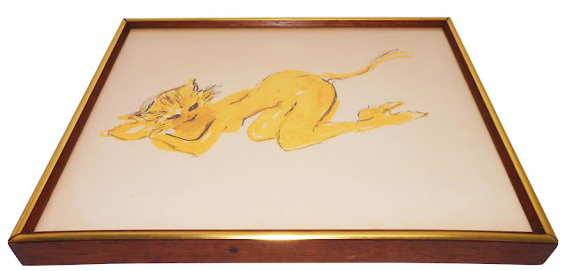 A fantastic and extremely rare original work of art by the venerated and widely celebrated 20th century American graphic artist and painter LeRoy Neiman. This is a New York City framed original and authentic watercolor painting, titled 'Smitten Kitten.' It was made in association with Woody Allen's 1965 film 'What's New, Pussycat?' The watercolor painting, aqueous mixed media, hand-to-surface work of art, features hand-drawn black ink line, with graphite under-drawing. It's not a serigraph print edition, printed copy or a later facsimile (a pixelated production print.) The original watercolor painting is still in its original, mid-20th century period walnut frame, with a polished brass insert decorative sleeve edge and has the New York City picture framer's paper label still affixed to the undisturbed and unopened brown paper dustcover on the verso. It's unsigned on the pictorial plane but since the work of art remains untampered with, unopened, 100% undisturbed and exactly how it was when it was discovered and taken from the finely appointed Boston estate it was initially found in, it may or may not be signed by the artist on the back of the paper. There's some very minor, nearly unnoticeable tanning of the paper, which would be considered consistent with and commensurate with the watercolor painting's vintage pedigree. The glycerin vehicle in the watercolor paint has gathered, 'pooled' and is shiny in places. Graphite under-drawing is also visible. Very rare. Killer. One of (3) three similar figurative watercolor paintings by the late American artist LeRoy Neiman after the 1965 film 'What's New, Pussycat?' directed by Clive Donner and Richard Talmadge and produced by Charles K. Feldman. Unopened and untouched. Absolutely magnificent.